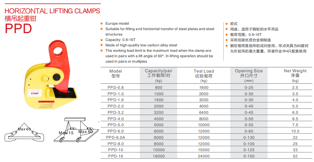 • The Rated Load refers to the maximum weight permitted for lifting when the clamps are used in pairs, with the lifting angle at the clamp point being $60$ degrees. Four clamps should be used as a set during lifting operations.